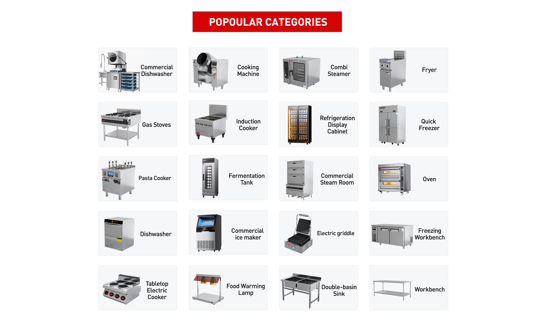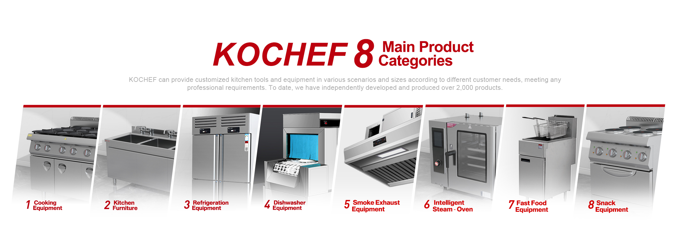 Productos principales:Equipo de cocina occidental comercial, mesas de trabajo de acero inoxidable, refrigerador comercial, horno de vapor comercial, equipo de escape de humo de cocina comercial
